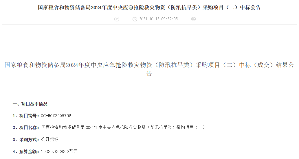 我司在激烈的国家粮食和物资储备局2024年度中央应急抢险救灾物资(防汛抗旱类)采购项目(二)竞标中成功中标!本次共中两个包,合计中标金额达1393.97万元。