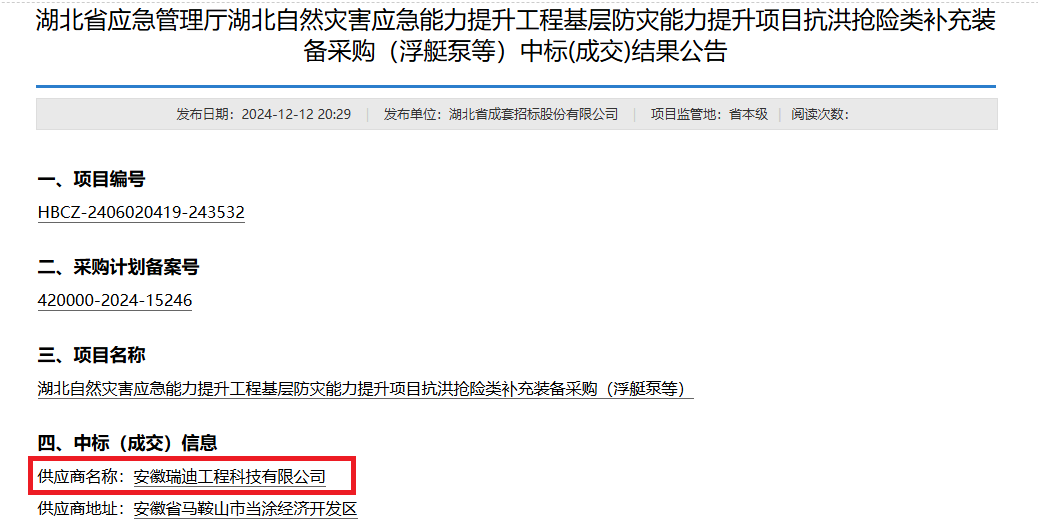热烈祝贺我司在湖北省应急管理厅湖北自然灾害应急能力提升工程基层防灾能力提升项目抗洪抢险类补充装备采购(浮艇泵等)招标中脱颖而出,成功中标!中标金额为 4896.227万元,这是公司发展历程中的又一重要里程碑!