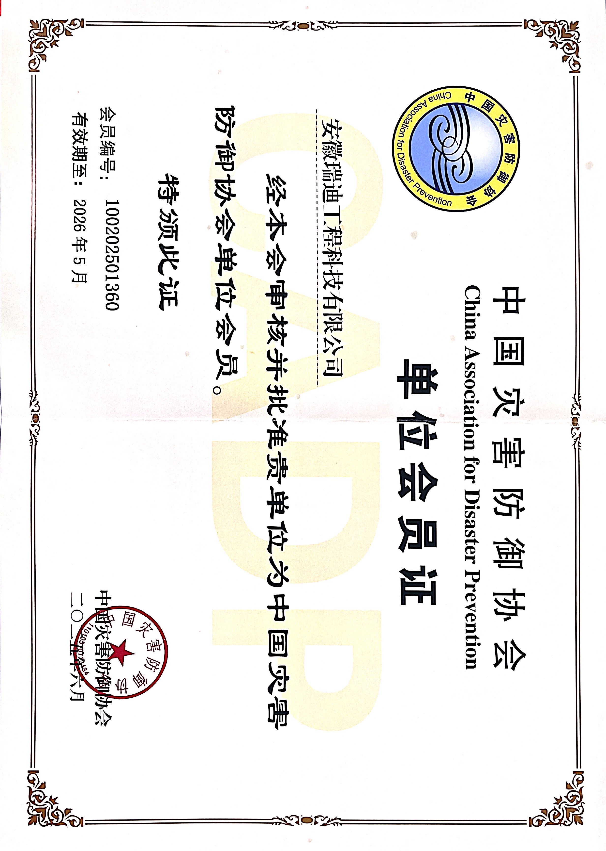 近日,经中国灾害防御协会严格审核与批准,安徽瑞迪工程科技有限公司正式成为中国灾害防御协会会员单位。