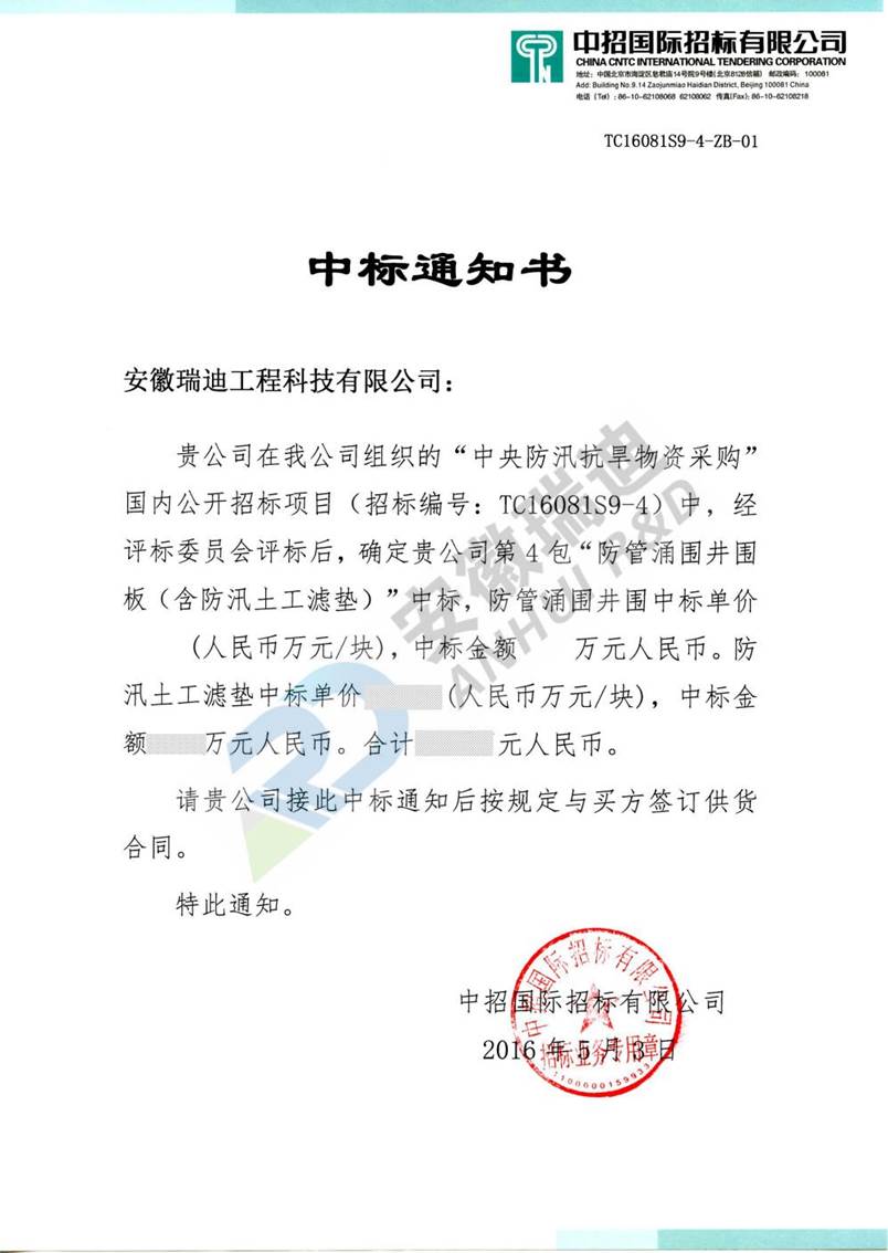 我公司凭借过硬的产品品质、完善的技术方案及合理的产品报价在竞争对手中脱颖而出,顺利中标中央防汛抗旱物资采购项目(招标编号:TC16081S9-4)第四包“防管涌围井围板(含防汛土工滤垫)”中标。