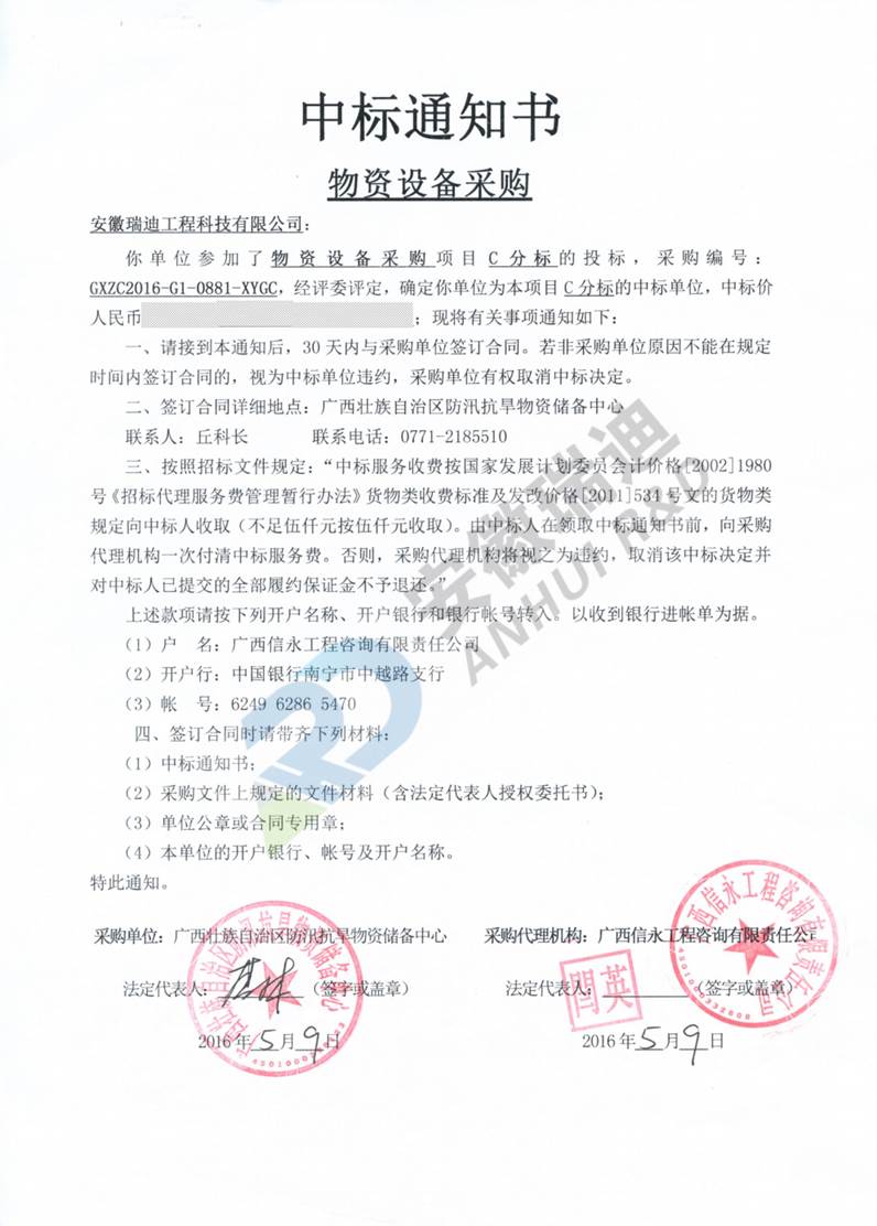 我公司凭借过硬的产品品质、完善的技术方案及合理的产品报价在竞争对手中脱颖而出,顺利中标广西壮族自治区防汛抗旱物资储备中心(简称“招标人”或“甲方”)物资采购项目(采购编号:GXZC2016-G1-0881-XYGC)C分标。