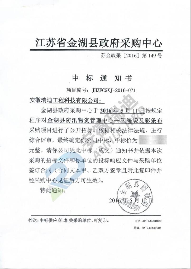 我公司凭借过硬的产品品质、完善的技术方案及合理的产品报价在竞争对手中脱颖而出,顺利中标金湖县防汛物资管理中心塑编袋及彩条布采购项目(采购编号:JHZFCGXJ-2016-071)。