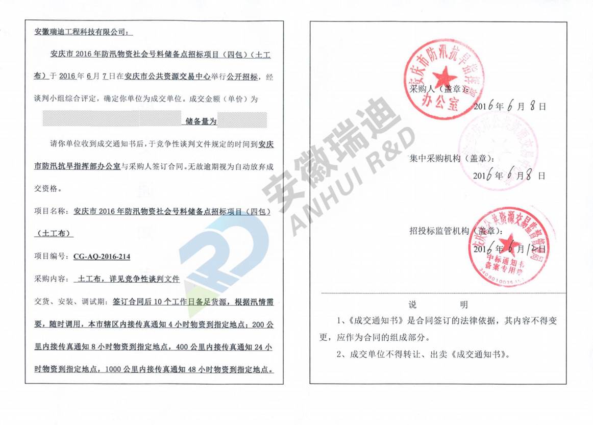 我公司凭借过硬的产品品质、完善的技术方案及合理的产品报价在竞争对手中脱颖而出,顺利中标安庆市2016年防汛物资社会号料储备点招标项目(项目编号:CG-AQ-2016-214)第四包(土工布)。