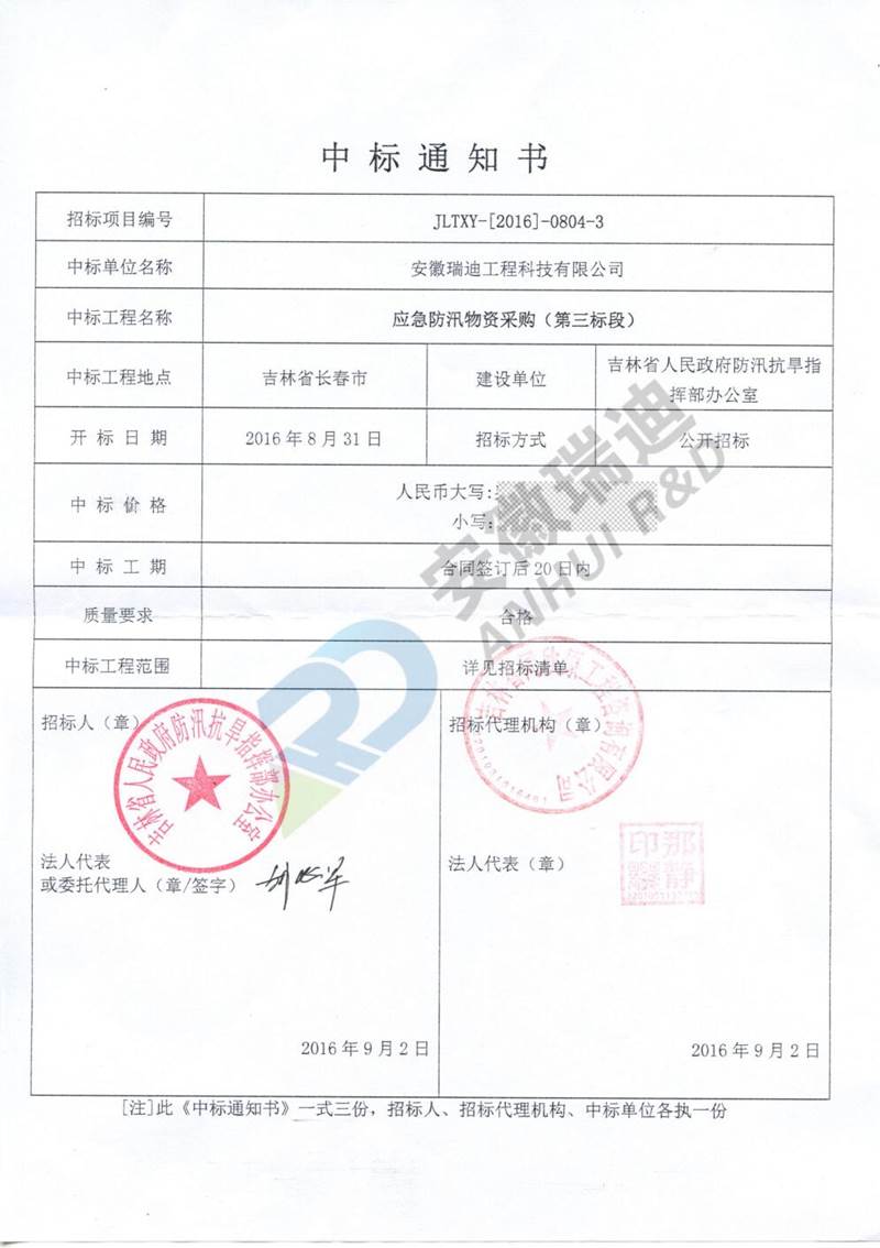 我公司凭借过硬的产品品质、完善的技术方案及合理的产品报价在竞争对手中脱颖而出,顺利中标吉林省人民政府防汛抗旱指挥部办公室应急防汛物资采购项目第三标段(采购编号:JLTXY-[2016]-0804-3)。