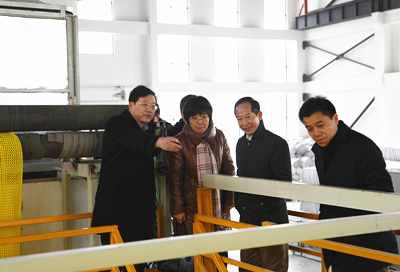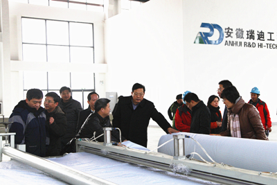 2014年12月11日下午,南京水科院院长张建云、副院长孙金华、总工程师窦希萍、总会计师薛亚云等一行来到当涂试验基地视察基地建设和试验生产项目进展情况。在总公司投资建设的安徽瑞迪工程科技有限公司土工席垫试验厅,安徽瑞迪公司总经理鄢俊向张院长一行详细介绍了生产设备、原材料、生产工艺和流程、产品销售、市场开拓以及公司的运行管理等情况。