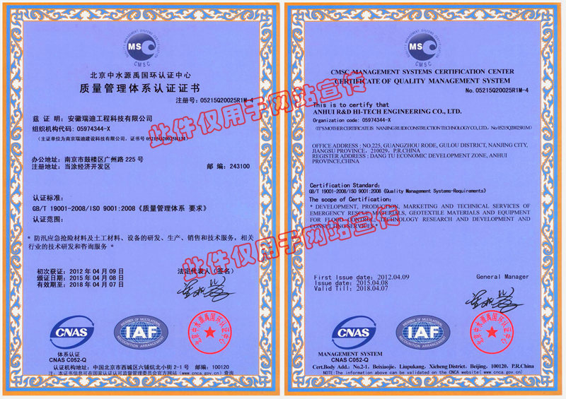 在瑞迪科技总公司的统一组织下,安徽瑞迪工程科技有限公司于2015年3月31日接受了北京中水源禹国环认证中心专家的外部审查,并于近日顺利取得质量管理体系认证证书;这为公司进一步的规范管理和市场开拓等提供了有力的支撑。