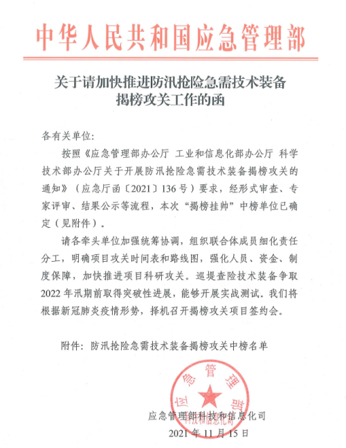 2021年10月15日,应急管理部公布了“关于防汛抢险急需技术装备揭榜攻关”评审结果,水利部 交通运输部 国家能源局 南京水利科学研究院、安徽瑞迪工程科技有限公司、江苏省水旱灾害防御调度指挥中心共同完成的“堤防溃口快速封堵关键技术装备项目”成功入选。
