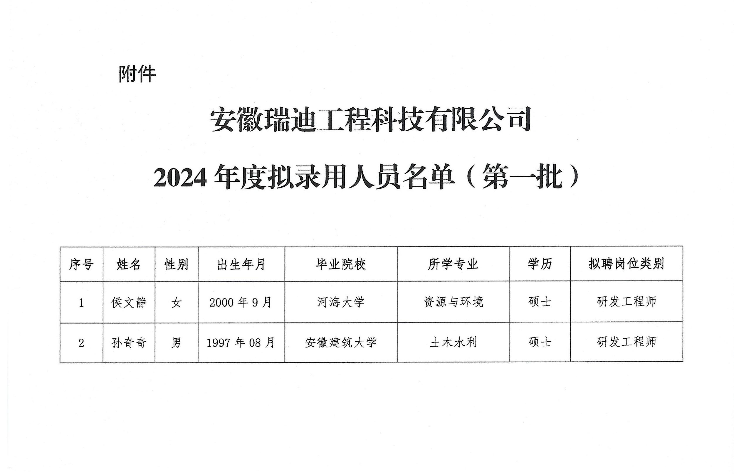 根据公开招聘工作有关要求,经过报名、资格审核、面试、体检等程序,确定侯文静等2人为安徽瑞迪工程科技有限公司拟录用人员(具体名单详见附件,按姓氏笔画排序)。