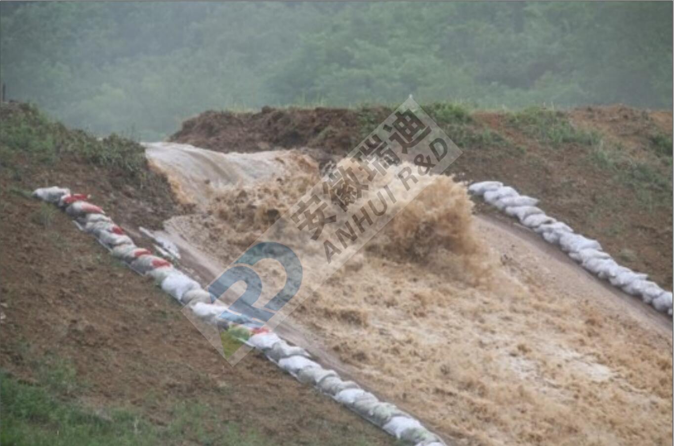汛期,洪水漫溢险情时有发生,紧急险情下,要建立临时溢洪道主动泄洪,降低溃坝风险。泄洪防护垫专门用于防止临时泄洪时背水坡泄洪段的冲刷破坏,其结构分为三层,外层为高强防护布,中间层为特殊结构网状体,底层为高摩擦抗滑防渗体。宽幅最大6.0m,单体长度30米。具有抢险速度快、连接方便、抗滑稳定性好和能重复利用等优点。