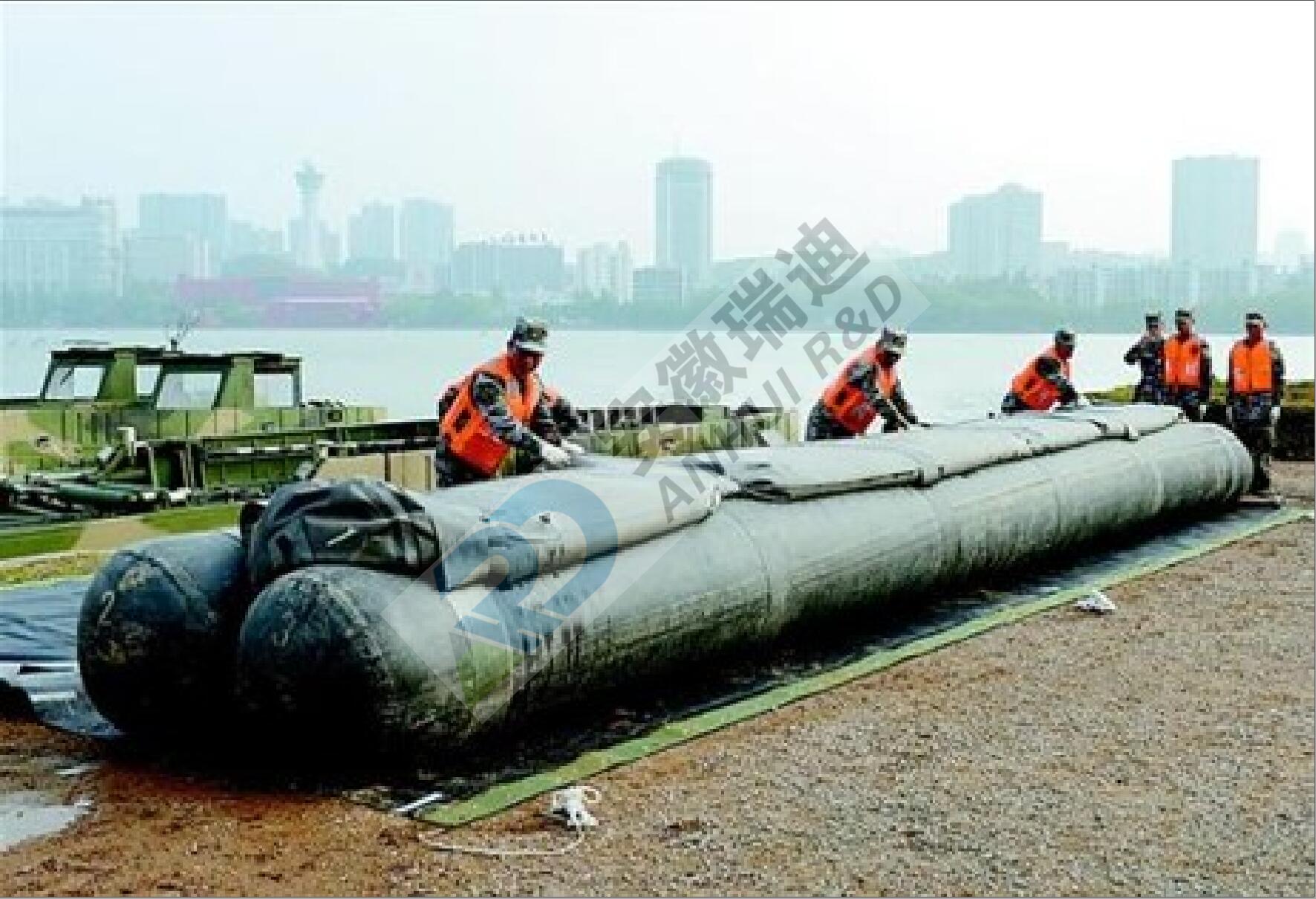 充水式橡胶子堤是由充水胶囊和防护垫片构成,三个胶囊固定成一个稳定三角形,主要用于城市防洪抢险、堤坝的临时加高、阻滞洪水漫溢等。其特点是重量轻、耐压强度高、气密性能优良,是一种轻便、灵活、高效、可重复使用的防汛抢险工具。