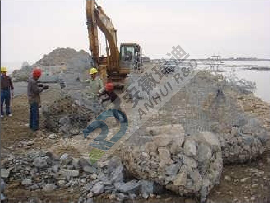 钢丝网兜主要用于防汛抢险加固、堵口、崩岸处理及工程基础防护等。其原理是先将块石放入网兜打包 起来,再利用机械设备将网兜块石送到河床表面上,进行水下抛投。利用这种方法进行抛石施工,水流对块 石基本不产生漂移距,同时块石对河床面的冲击力也大大减少。