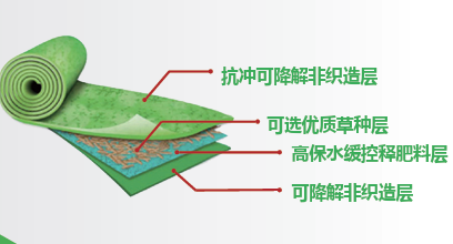可降解生态植生带是一种用于草坪建植的高效、 环保的工厂标准化定型产品。根据不同草种生长规 律,采用具有针对性的科学配比,将草种、缓释肥、 保水剂等按一定的密度定植在可自然降解的无纺布材 料上,经机器滚压针刺复合成型的多功能复合结构。