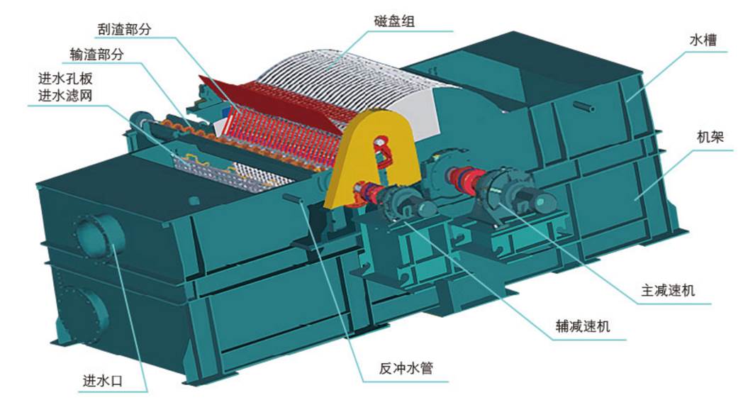 4)由磁盘分离出来的微磁絮团经磁回收系统实现磁性物质和非磁性污泥的分离,磁性物质回收再利用(回收率>99.6%),污泥进入污泥处理系统,经污泥泵打入污泥脱水系统,脱水后污泥外运。