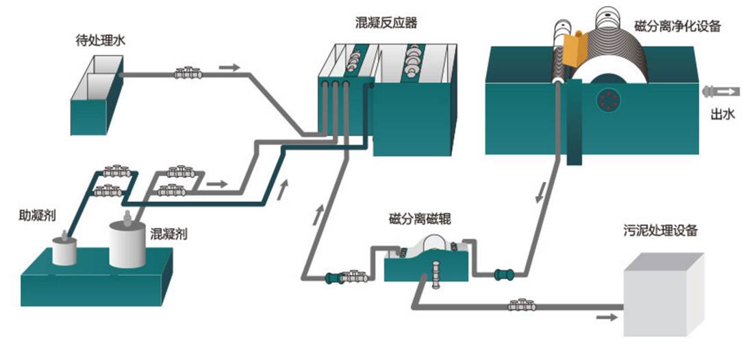 超磁分离水体净化技术,它与普通的沉淀、过滤相比,设备具有连续运行,可高效分离水中悬浮物的特点,工艺上具有流程短、占地少、投资省、运行费用低等优势。