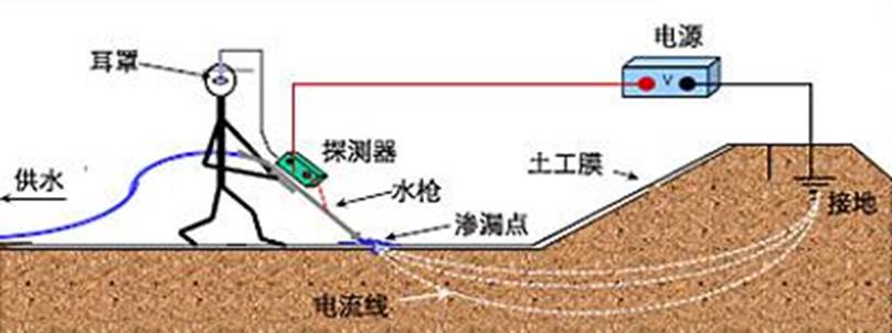 在双电极土工电学渗漏破损探测方法中,将不同电势施加到土工膜(泥土或水)上面及其下面。覆盖土工膜的泥土或水的电势场相对均匀。土工膜为一种极其有效的绝缘体,在存在孔洞时电场导通,通过移动测量仪探测导通位置,精确定位产生渗漏孔洞的点。原理如下图: